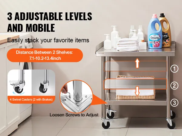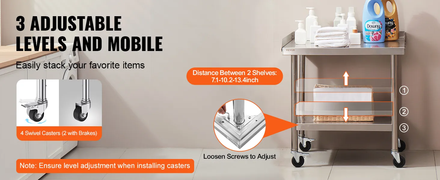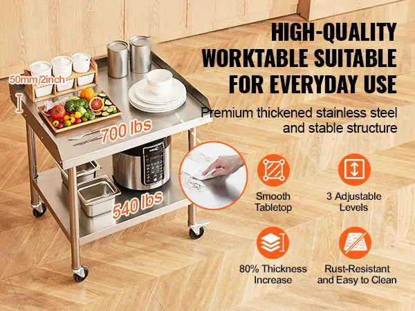 Stabiel en duurzaam: met een verbeterde dikte van 0,8 mm is deze tafel stevig en duurzaam. Het bovenste niveau ondersteunt maximaal 318 kg (700 lbs), het onderste niveau ondersteunt maximaal 250 kg (540 lbs). Hierdoor heb je voldoende opbergruimte voor je benodigdheden en stapel je jouw favoriete ingrediënten gemakkelijk op.