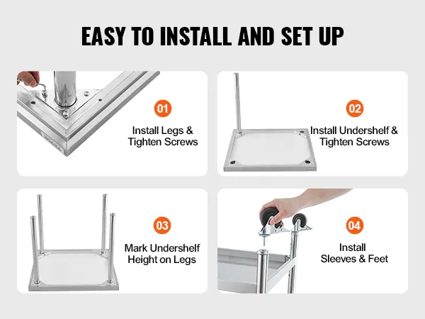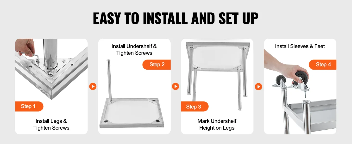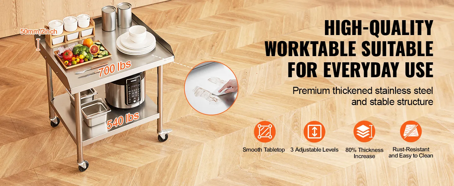 Het is gebouwd om lang mee te gaan. Het heeft een dik, robuust tafelblad dat niet doorbuigt onder zware lasten. De vier stevige poten bieden uitstekende ondersteuning. Dit maakt het perfect voor het vasthouden van zware keukenapparatuur of tuingereedschap voor buiten. Het roestvrijstalen materiaal draagt bij aan de duurzaamheid. U kunt het vertrouwen voor zowel binnen- als buitentaken zonder zorgen. Het maakt niet uit of u zware kookapparatuur of tuingereedschap voor buiten hanteert, deze werktafel is betrouwbaar. Roestvrij staal helpt ook om het jarenlang sterk en bruikbaar te houden. bestand tegen roest en weersomstandigheden. Daarom behoudt de tafel zijn sterkte en blijft hij efficiënt functioneren. Dat betekent dat u zich geen zorgen hoeft te maken.