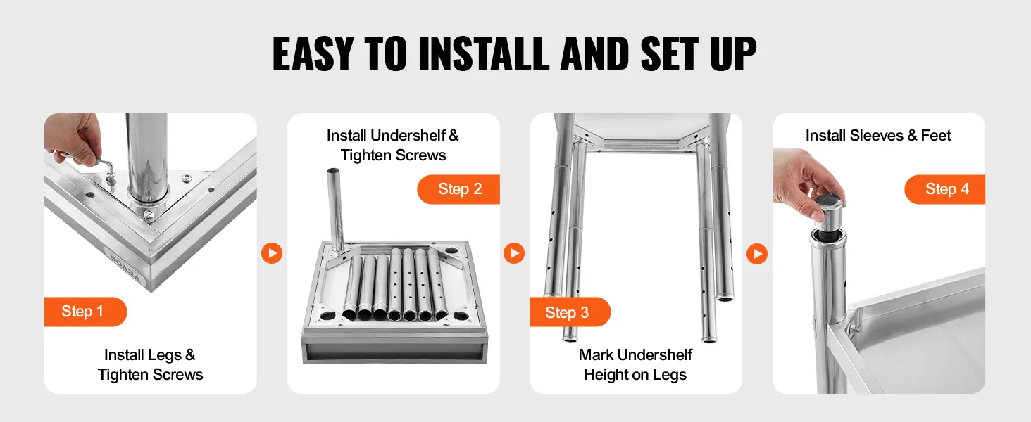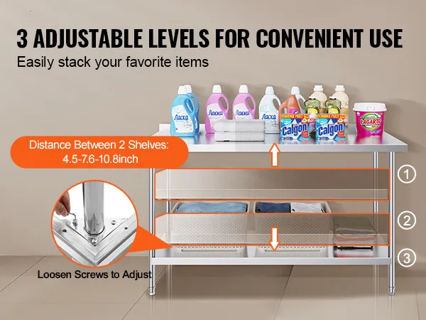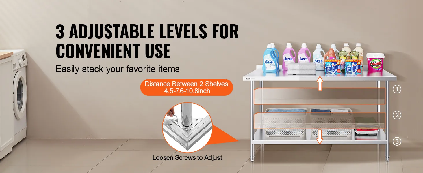 User-Friendly Design: Featuring 3-level adjustable shelves, this work table offers the most user-friendly and practical functionality. Simply adjust the shelf height with screws to accommodate items of different sizes. The high rear backsplash prevents items from falling off and guards against water splashes.