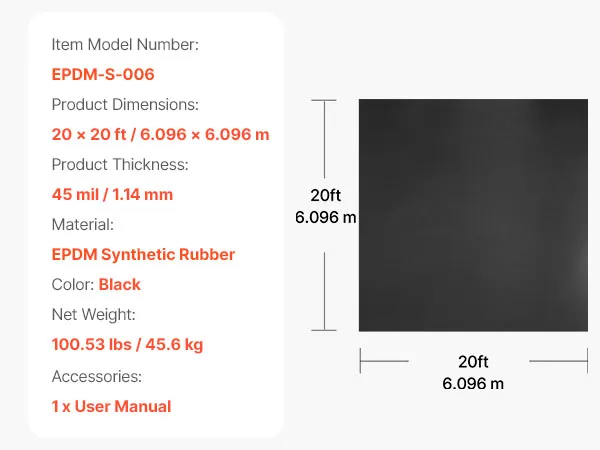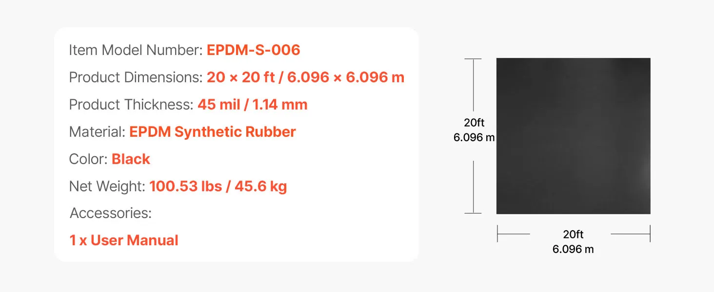 VEVOR Dakbedekking, 6,096 x 6,096 m, Dakbedekking, 1,14 mm EPDM-folie, Carport waterdicht, Duurzaam en weerbestendig, Dakwaterdichting, Dakbedekking voor campers, Daken, Vijvers