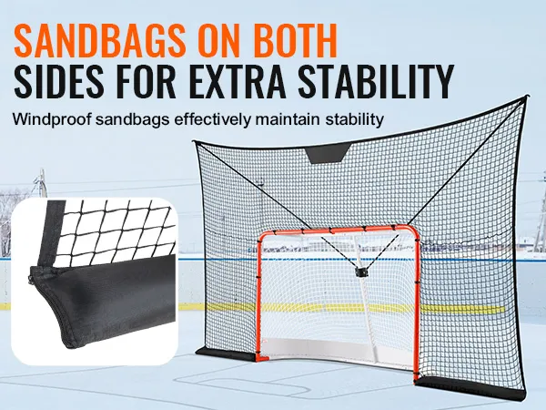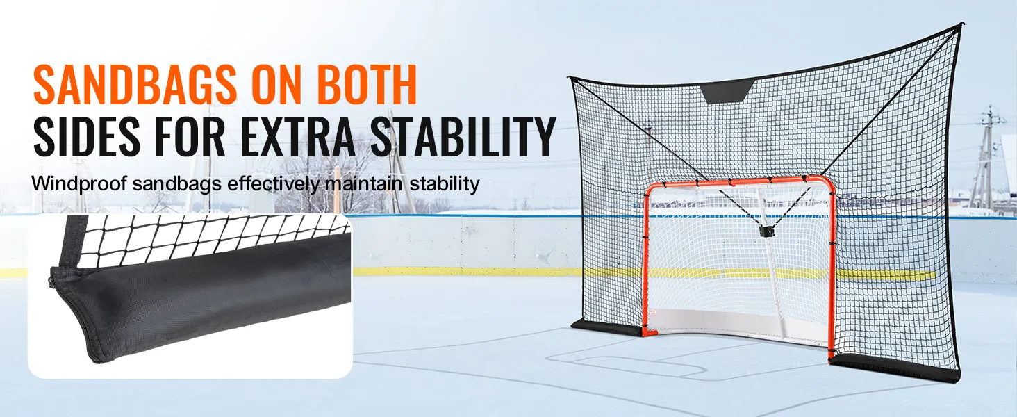 Stabilisatieontwerp voor zandzakken: robuuste, weerbestendige zandzakken aan beide zijden verhogen de stabiliteit van het eenvoudig op te zetten hockeynet, waardoor u minder hoeft te bukken om de puck op te pakken en efficiënter te oefenen.