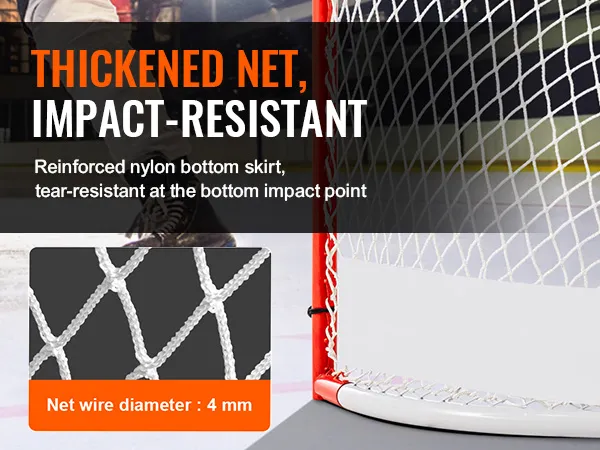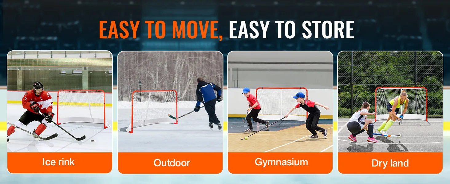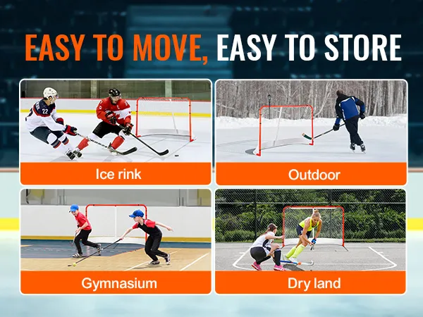 Handige mobiliteit: het afneembare ontwerp zorgt voor gemakkelijke mobiliteit, zodat dit hockeydoel gemakkelijk kan worden vervoerd naar sporthallen, ijsbanen, droge ruimtes of buitenshuis, zodat je altijd en overal hockey kunt oefenen.