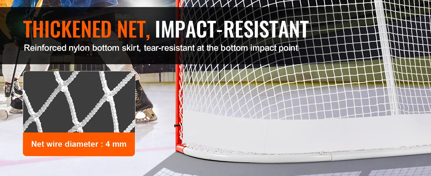 Hoogwaardig materiaal: het straathockeynet is gemaakt van hoogwaardige stalen buizen met een diameter van 38 mm (1,5 inch) en een net van 4 mm dik, dat slijtvast en duurzaam is. De met nylon versterkte onderrok is scheurbestendig en kan seizoen na seizoen worden gebruikt.
