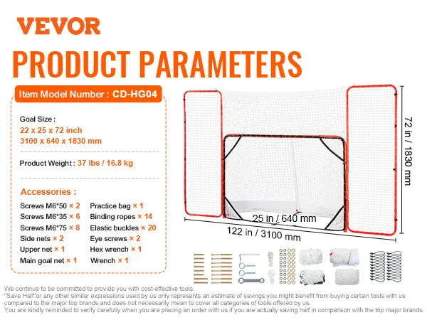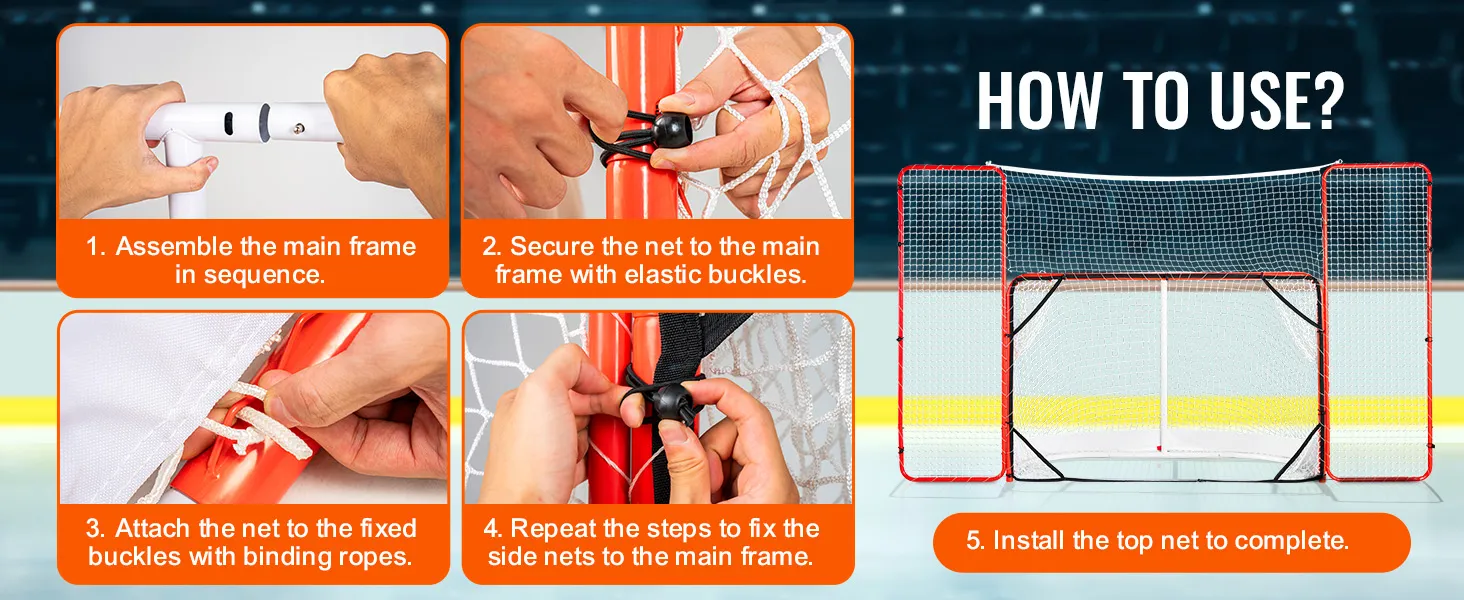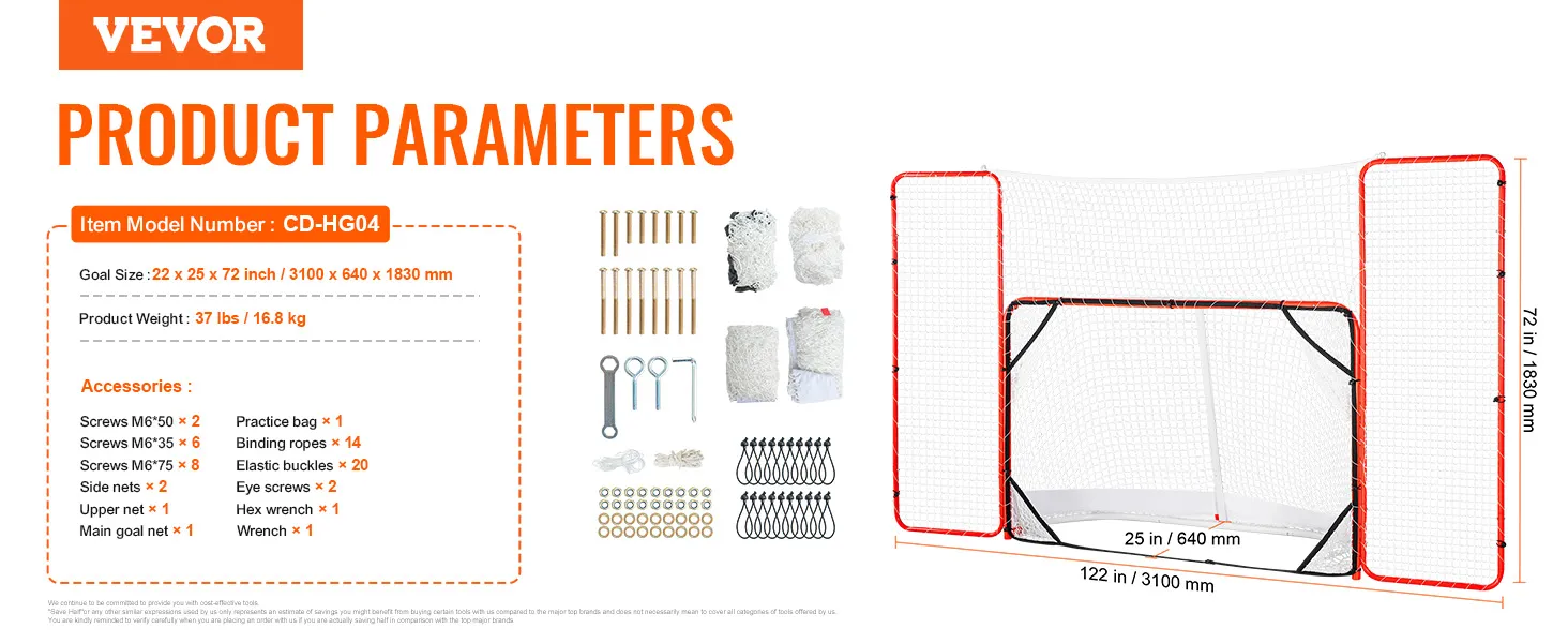 Stabiel & eenvoudig op te zetten: Het mobiele hockeydoel is zeer eenvoudig op te zetten. Het frame klikt gemakkelijk in elkaar met spijkers en een paar schroeven, en de achterste draadlussen met elastische banden maken het bevestigen van het net eenvoudig. Iedereen kan hem eenvoudig zonder gereedschap opzetten, zodat jij je kunt concentreren op het spel.