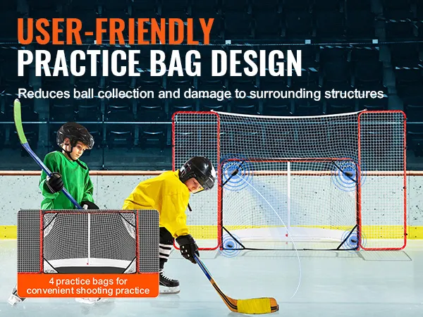 Gebruiksvriendelijk ontwerp: het hockeydoel voor binnen en buiten is voorzien van zijnetten die helpen bij het oefenen van hockeyschoten over lange afstanden en het onderscheppen van pucks verminderen. Het beschermt ook uw buitenruimte tegen pucks die tegen de buren of de garage stuiteren en is een uitstekende bescherming voor garagedeuren.