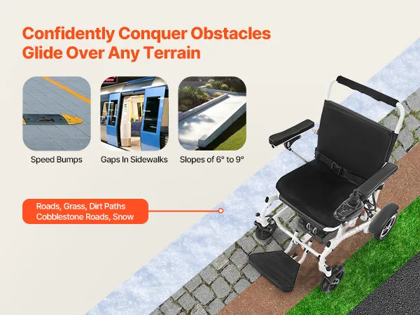 11-inch massieve banden: Uitgerust met lekbestendige 10-inch (ongeveer 25,4 cm) massieve banden biedt deze elektrische rolstoel uitstekende stabiliteit en duurzaamheid. Het diepe profiel verbetert de grip en maakt hellingen van 6° tot 9° mogelijk.