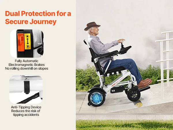 Onze elektrische rolstoel is opvouwbaar, waardoor hij gemakkelijk op te bergen en te vervoeren is. Dankzij de schokabsorberende banden en het uitstekende klimvermogen rijdt hij moeiteloos op verschillende terreinen en biedt hij een soepele rit.