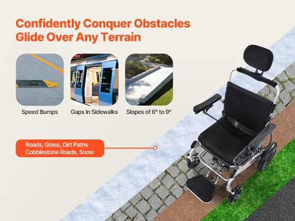 11-inch massieve banden: Uitgerust met lekvrije 10-inch massieve banden biedt deze elektrische rolstoel uitstekende stabiliteit en duurzaamheid. Het diepe profiel verbetert de grip en maakt hellingen van 6° tot 9° mogelijk.