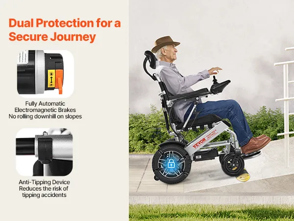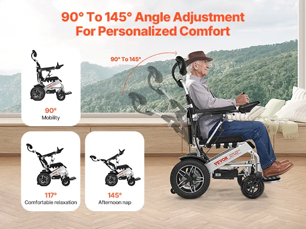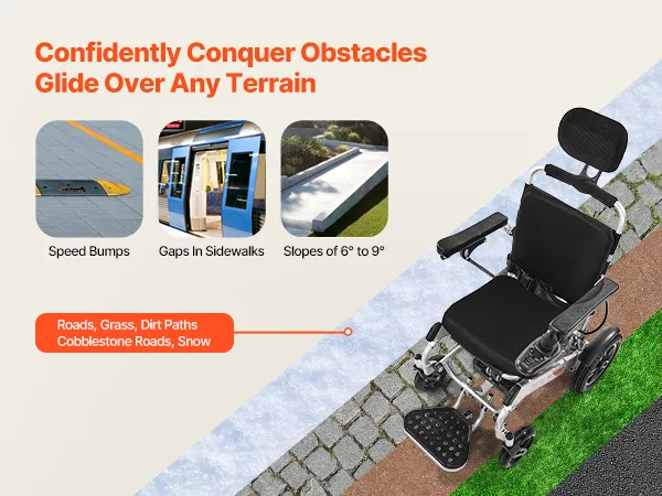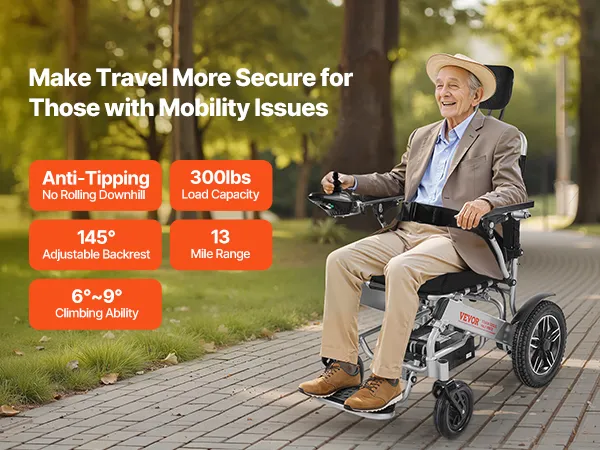 Onze elektrische rolstoel is opvouwbaar, waardoor hij gemakkelijk op te bergen en te vervoeren is. Dankzij de schokabsorberende banden en het uitstekende klimvermogen rijdt hij moeiteloos op verschillende terreinen en biedt hij een soepele rit.