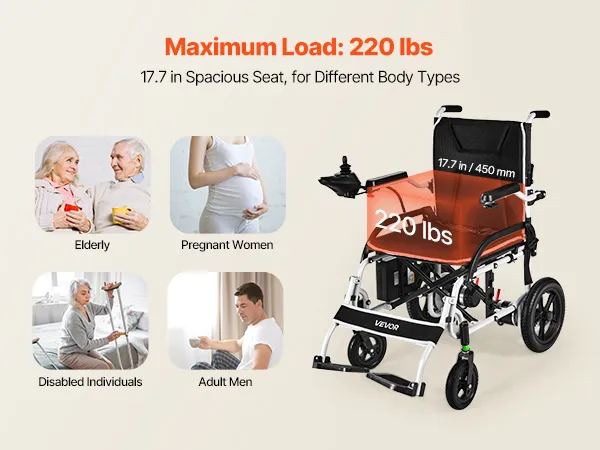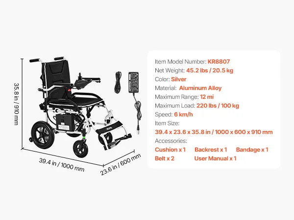 Belastbaarheid tot 100 kg: De ruime zitting van 45 cm breed biedt comfort en stabiliteit en ondersteunt tot 100 kg. Het robuuste metalen frame zorgt voor een lange levensduur en maakt deze elektrische rolstoel ideaal voor dagelijks gebruik.