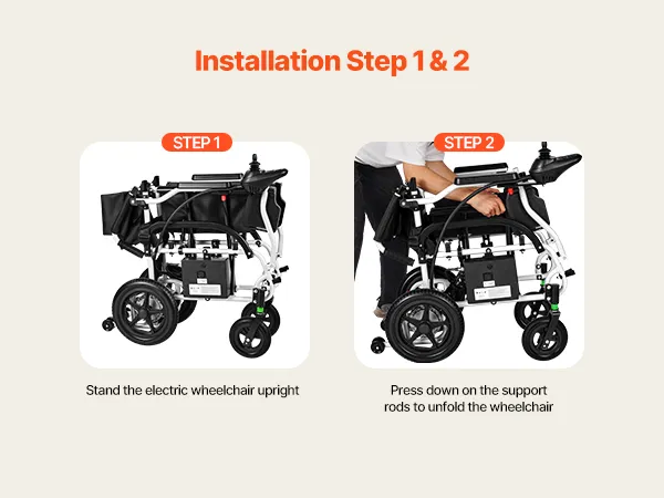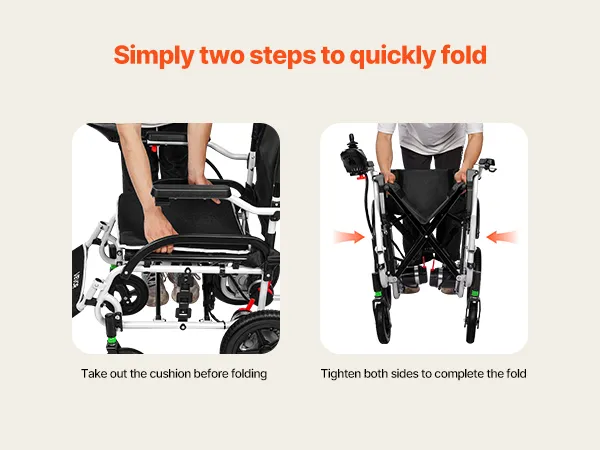 Opvouwbaar met één knop: De elektrisch opvouwbare rolstoel is eenvoudig op te vouwen met het éénknopssysteem. Compact en lichtgewicht, ideaal voor op reis, gemakkelijk te vervoeren en op te bergen – voor uitstapjes naar ziekenhuizen, luchthavens en meer.