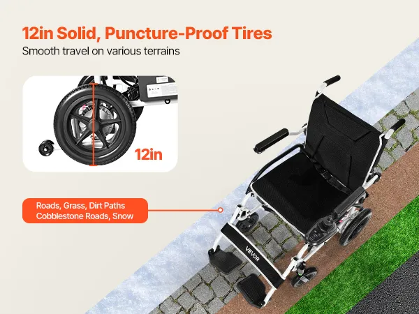 Massieve banden van 30,5 cm: Uitgerust met lekbestendige massieve banden van 30,5 cm biedt deze elektrische rolstoel uitstekende stabiliteit en duurzaamheid. Het diepe profiel voorkomt slippen en zorgt voor een veilige en soepele rit op gevarieerd terrein.