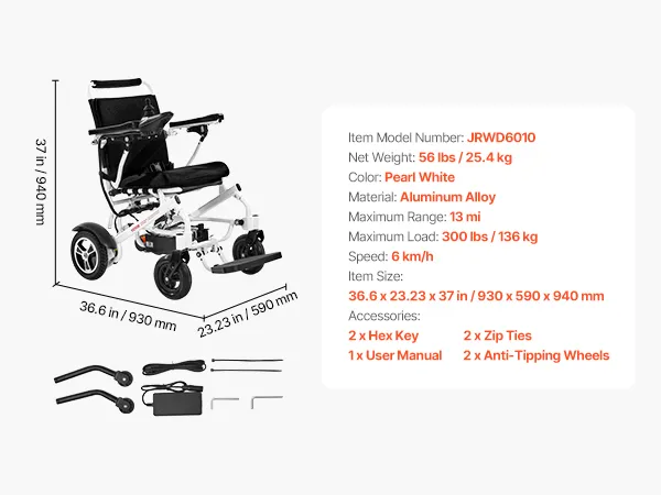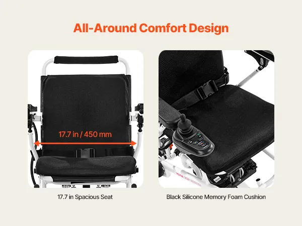 Belastbaarheid tot 136 kg: De ruime zitting van 45 cm breed biedt comfort en stabiliteit en ondersteunt tot 136 kg. Het robuuste metalen frame zorgt voor een lange levensduur en maakt deze elektrische rolstoel ideaal voor dagelijks gebruik.
