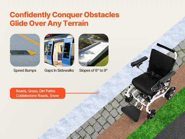 10-inch massieve banden: Uitgerust met lekvrije 10-inch massieve banden biedt deze elektrische rolstoel uitstekende stabiliteit en duurzaamheid. Het diepe profiel verbetert de grip en maakt hellingen van 6° of 9° mogelijk.