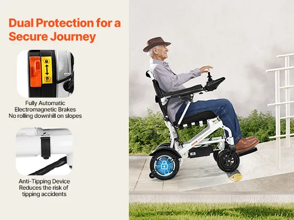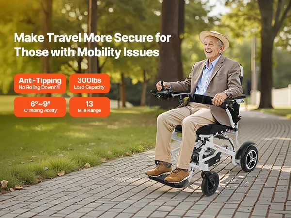 Onze elektrische rolstoel is opvouwbaar, waardoor hij gemakkelijk op te bergen en te vervoeren is. Dankzij de schokabsorberende banden en het uitstekende klimvermogen rijdt hij moeiteloos op verschillende terreinen en biedt hij een soepele rit.