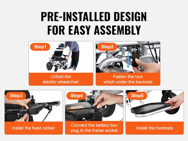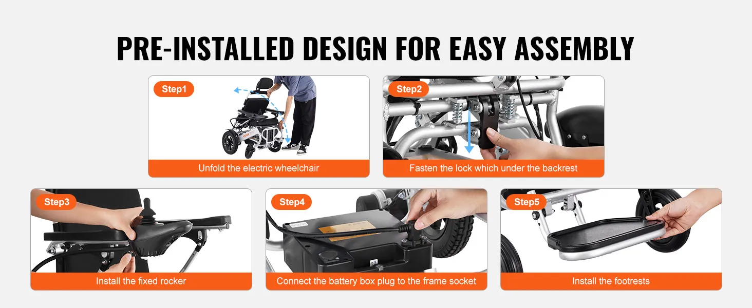 Dankzij de eenvoudige installatie kunt u de elektrische rolstoel snel gebruiken, waardoor u montagetijd en moeite bespaart. Gebruikers kunnen eenvoudig de stappen volgen voor een snelle montage, waardoor wachttijd of inspannende installatie worden geëlimineerd.