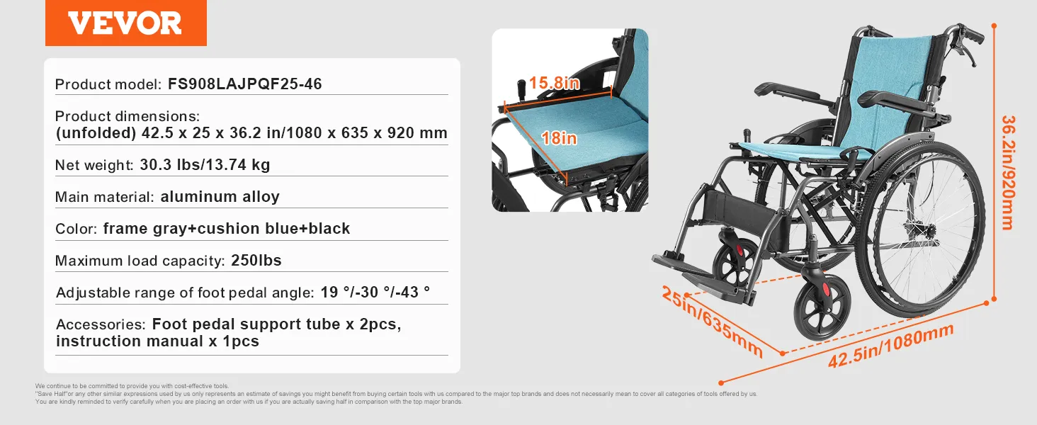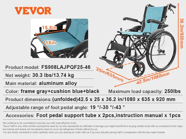 VEVOR rolstoel, duurzame, ultralichte rolstoel van aluminiumlegering, draagbare rolstoel met opklapbare armleuningen tot aan het bureau, 3-voudig verstelbare voetsteunen, 45 cm brede zitting, draagvermogen van 113 kg