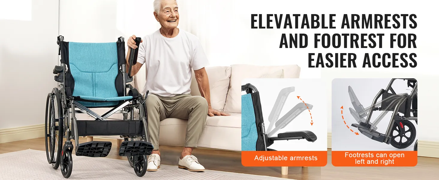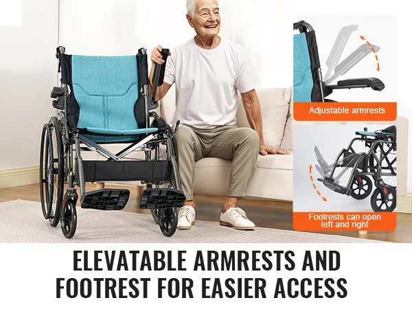 Deze rolstoel heeft verstelbare armleuningen en voetsteunen, waardoor u gemakkelijk in- en uitstapt. Het is ideaal voor senioren en anderen die extra hulp nodig hebben.