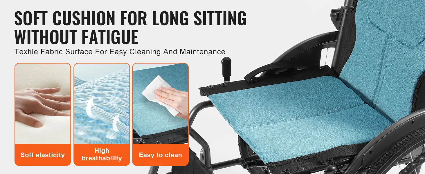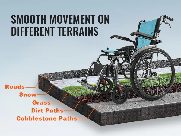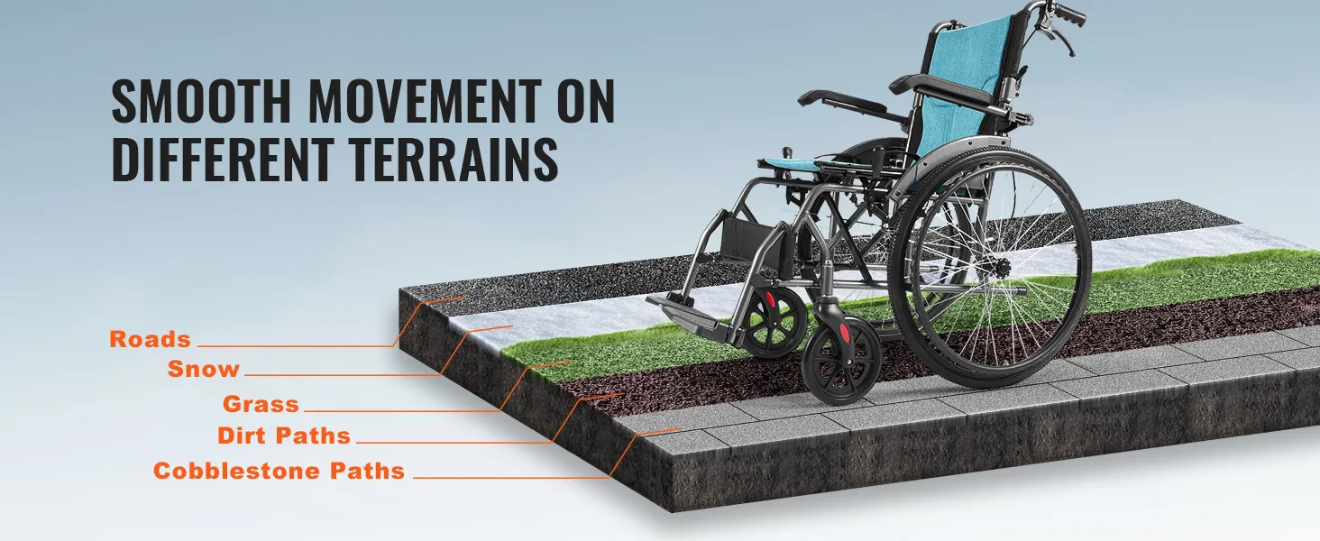 22"/55,88 cm massieve band: Deze rolstoel is voorzien van lekvrije, schokabsorberende banden met een grote diameter die de duwefficiëntie verbeteren. Het solide PU-materiaal voorkomt problemen met de bandenspanning, elimineert de zorgen over lekke banden, biedt uitstekende tractie met diepe loopvlakpatronen om uitglijden te voorkomen, en kan met gemak verschillende terreinen aan.
