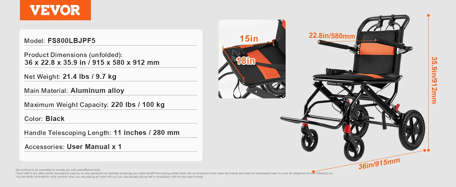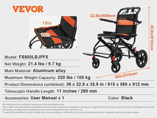 VEVOR rolstoel, ultralichte transportstoel van aluminiumlegering voor volwassenen, opvouwbare rolstoel met naar achteren opvouwbare armleuningen, bureaulengte, zelfblokkerende rem