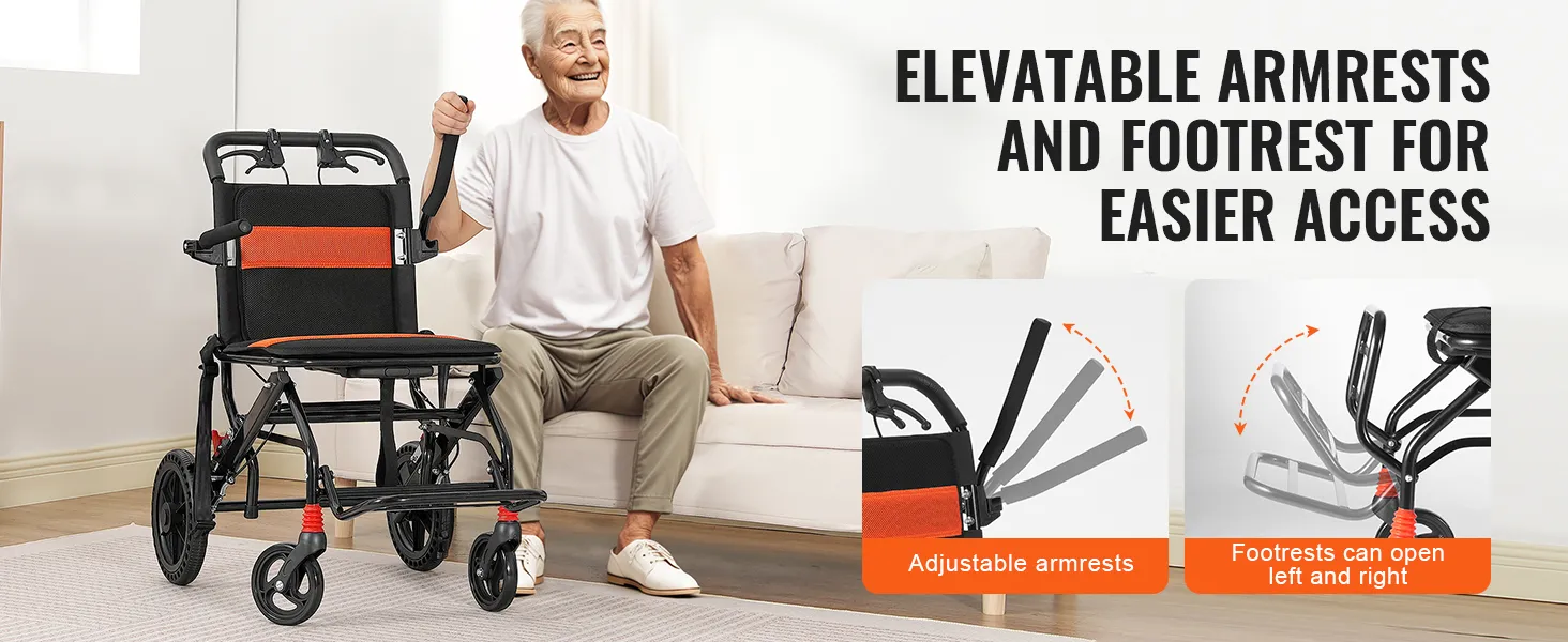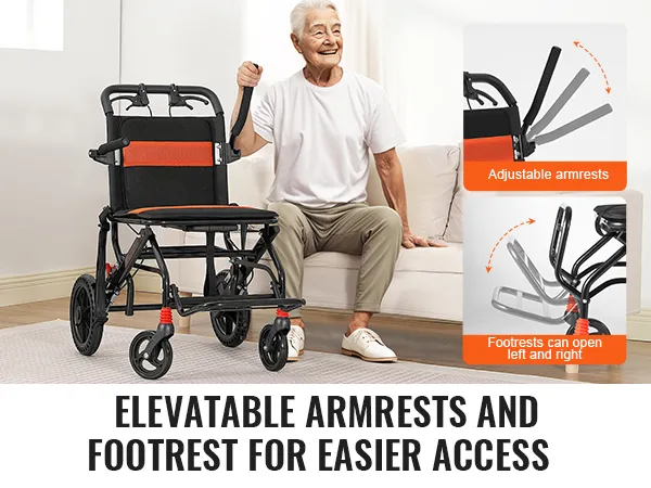 Deze rolstoel heeft verstelbare armleuningen en voetsteunen, waardoor u gemakkelijk in- en uitstapt. Het is ideaal voor senioren en anderen die extra hulp nodig hebben.