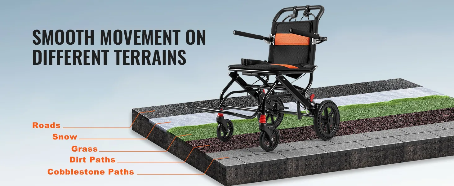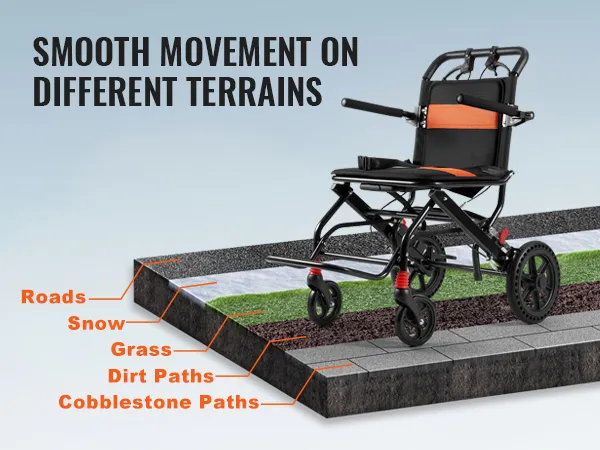 Deze rolstoel navigeert gemakkelijk over verschillende ondergronden, zoals wegen, gras, onverharde wegen, kasseien en sneeuw, waardoor naadloze mobiliteit wordt gegarandeerd, waar u ook gaat, wat gemak en comfort tijdens uw reis toevoegt.