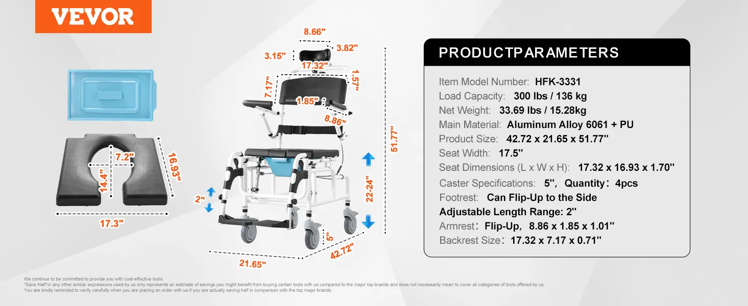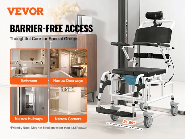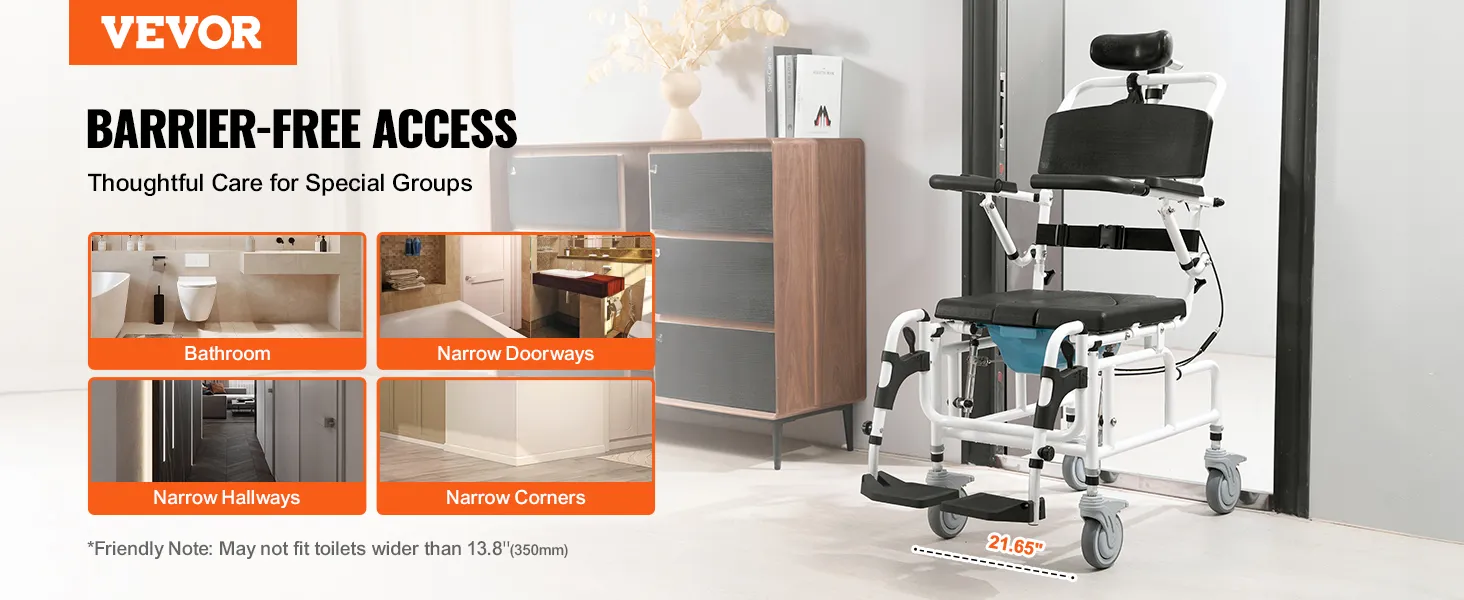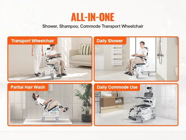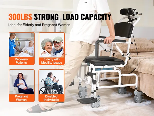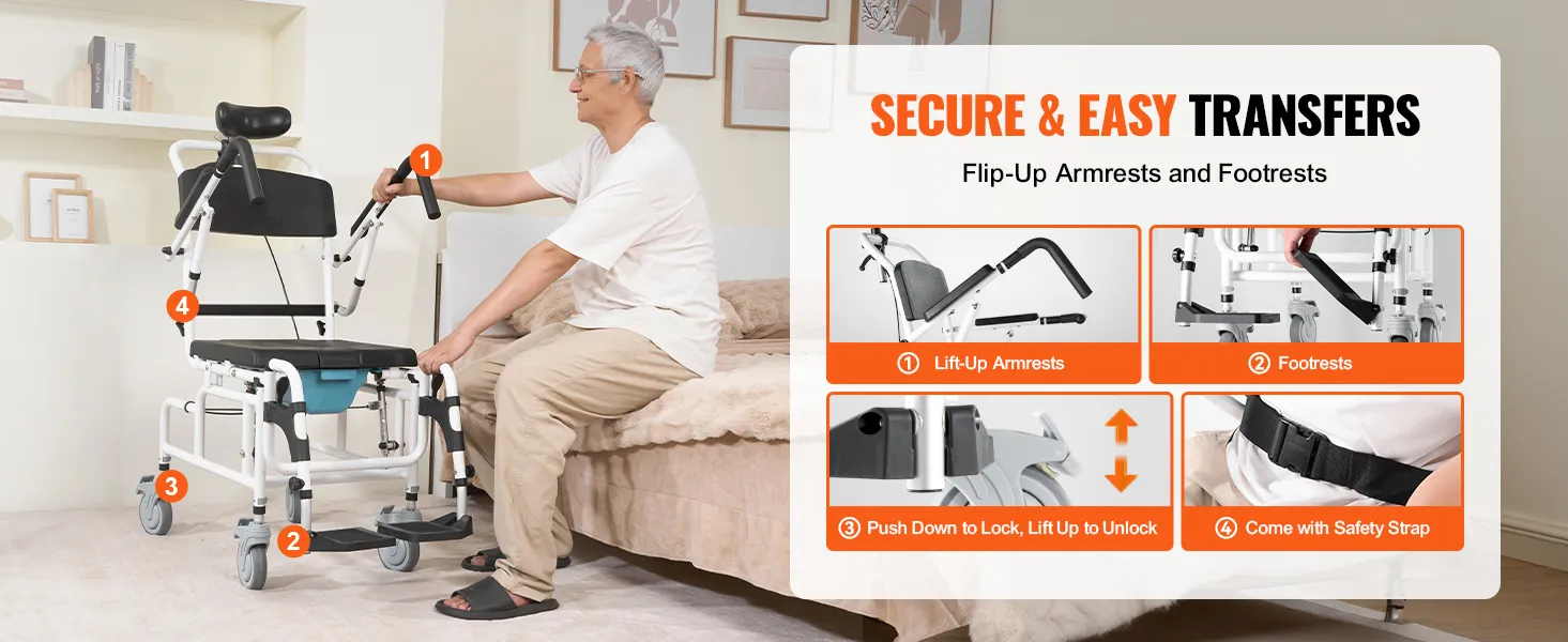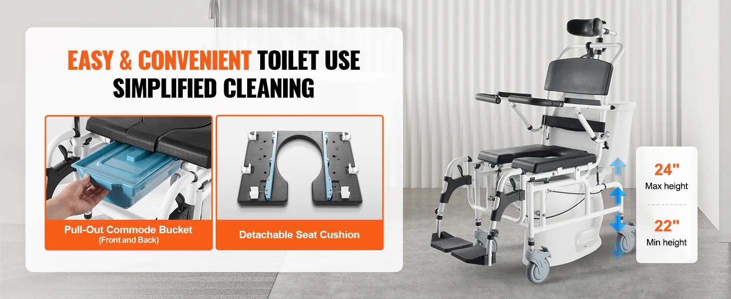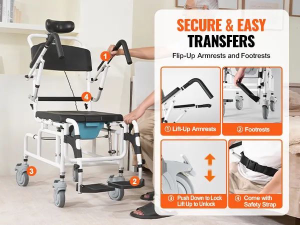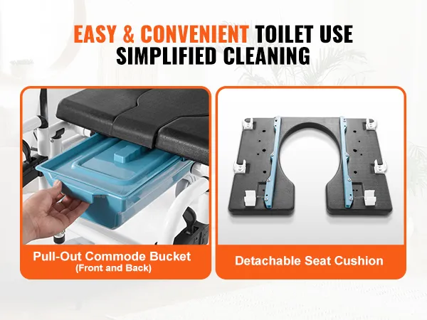 De stoel is zowel afneembaar als opvouwbaar. Hij is erg flexibel. U kunt hem aanpassen aan uw behoeften. Hij heeft 5-inch geremde wielen voor veilige beweging. De uitschuifbare commode en opklapbare voetensteun maken hem praktisch. De opklapbare PU-beklede armleuningen zorgen voor extra comfort. Deze flexibiliteit is perfect voor verschillende badkameropstellingen. Ook kunt u hem opbergen als u hem niet gebruikt.
