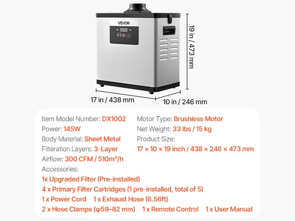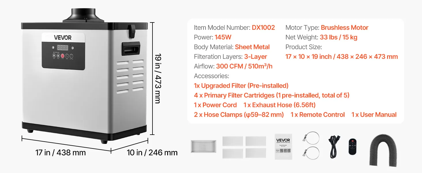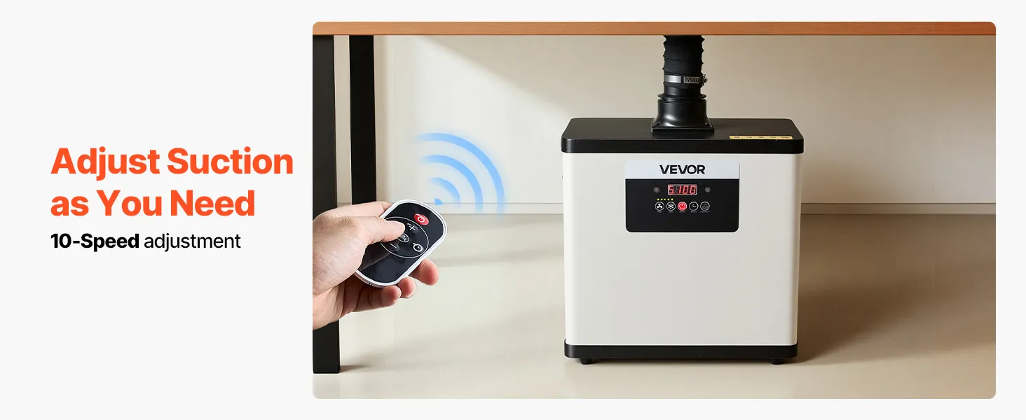 VEVOR Soldeerrookafzuiger, Lasrookafzuiger met 3-in-1 filter, Afzuigcapaciteit van 510 m³/u, 10 snelheidsniveaus, Borstelloze motor met afstandsbediening, Geschikt voor lasergraveren en 3D-printen