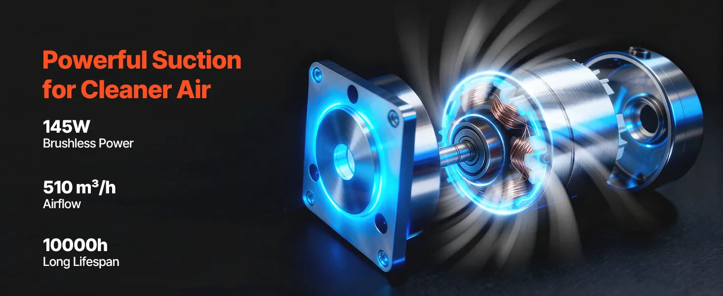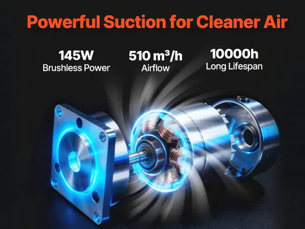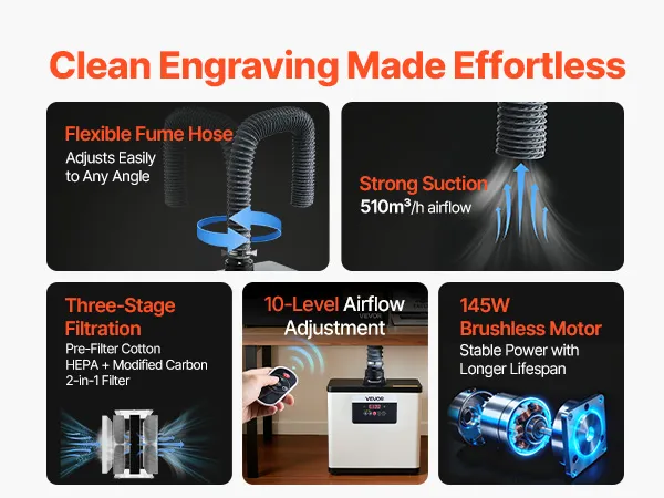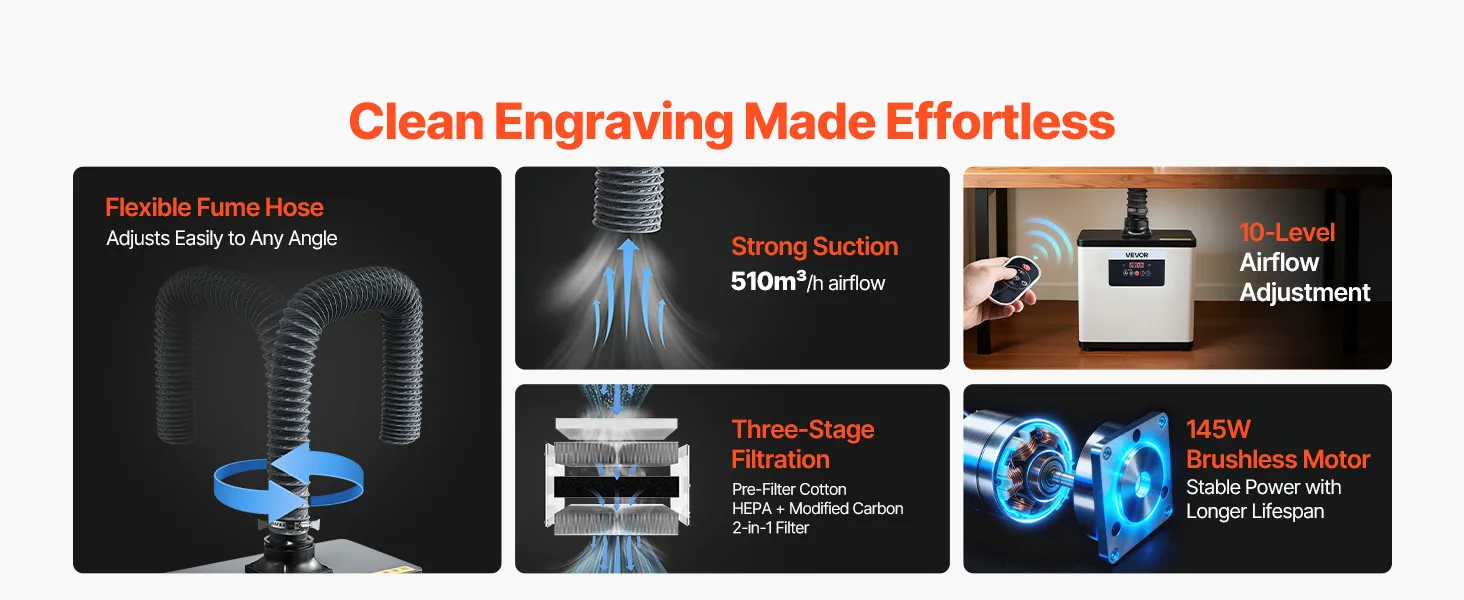 De VEVOR-afzuiger is speciaal ontworpen voor lasergraveren en 3D-printen en beschikt over een krachtige luchtstroom en een 4-laags filtersysteem. Aangedreven door een borstelloze motor van 145 W, levert hij een luchtstroom tot 510 m³/u met op afstand bedienbare, instelbare zuigkracht en vangt hij rook efficiënt op om uw werkplek schoon te houden.