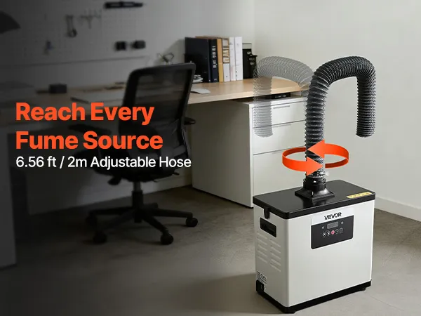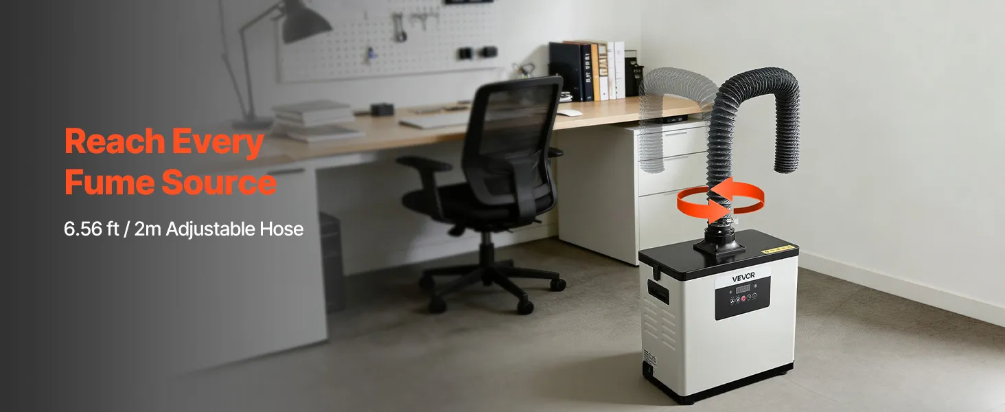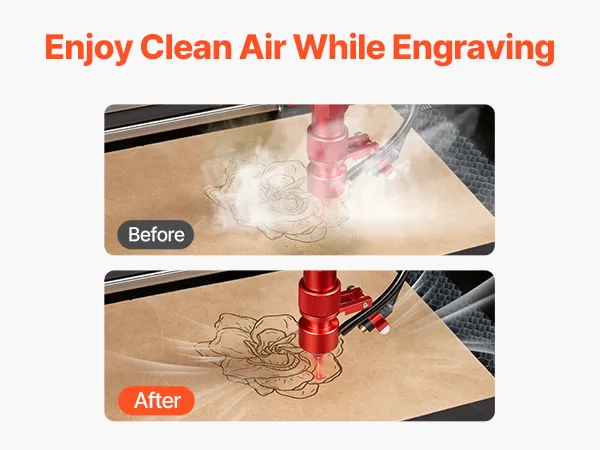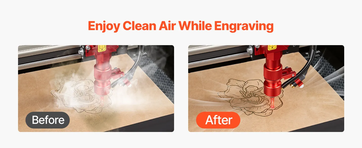 Flexibele afzuigslang van 360°: De 2 meter lange afzuigbuis kan 360° worden gedraaid, waardoor positionering in verschillende hoeken mogelijk is. Dit past zich aan verschillende opstellingen van laser graveer- of 3D-printwerkstations aan en zorgt voor een soepelere afzuiging van rook en een comfortabelere bediening.