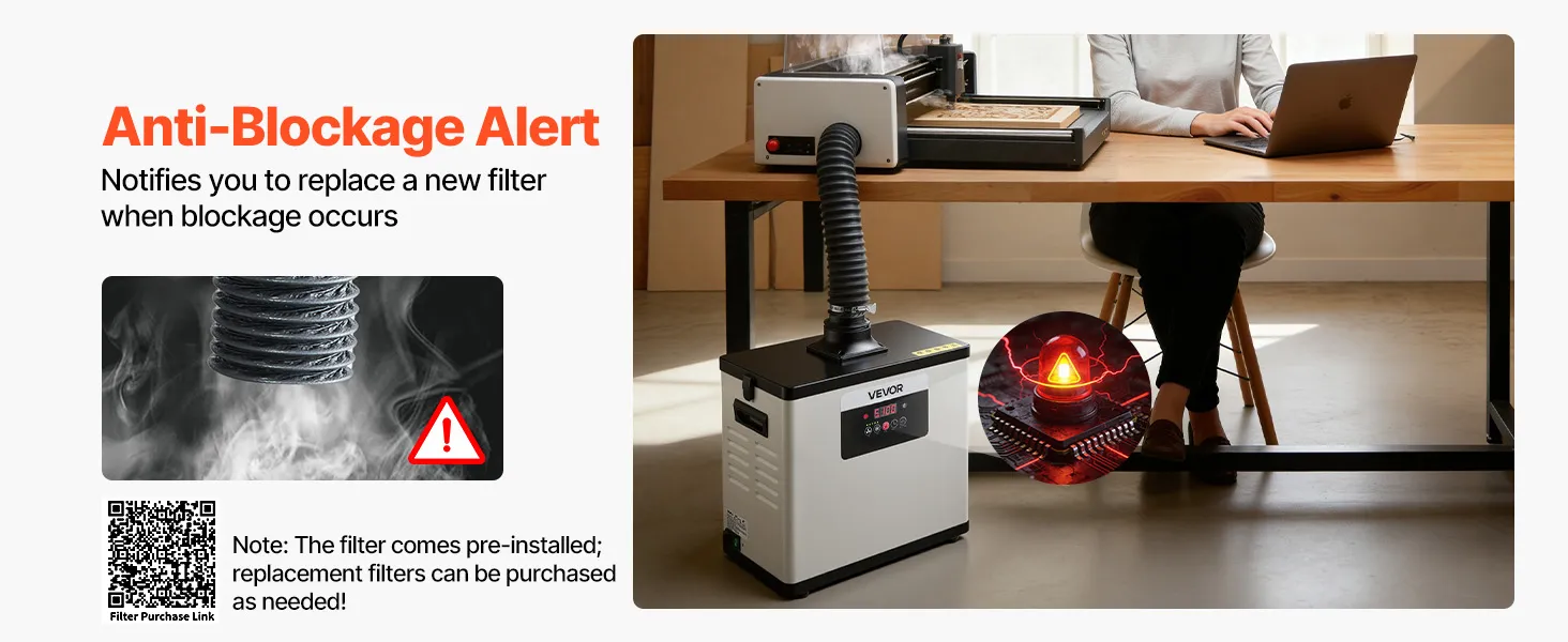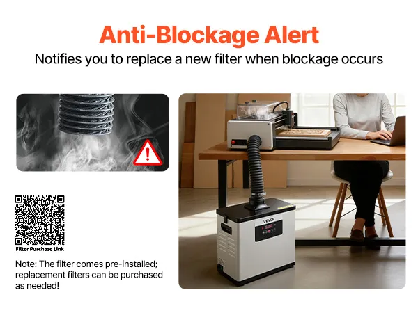 Intelligente waarschuwing bij verstopping: Nooit meer gissen wanneer u het filter moet vervangen! Wanneer het filter verstopt raakt, geeft deze graveerrookafzuiger automatisch een waarschuwing om u eraan te herinneren het filter tijdig te vervangen. (Het filter is voorgeïnstalleerd; vervangende filters kunnen indien nodig worden aangeschaft.)