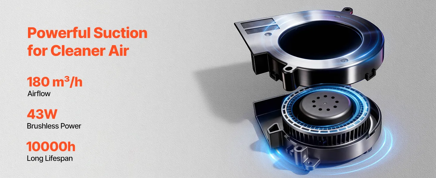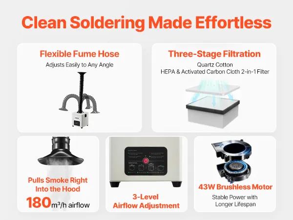 Krachtige afzuiging: Deze soldeerrookafzuiger is uitgerust met een borstelloze motor van 43 W en biedt een krachtige afzuigcapaciteit tot 180 m³/u. Hij vangt effectief soldeerrook, fijnstof en stof op, waardoor u comfortabeler kunt solderen.