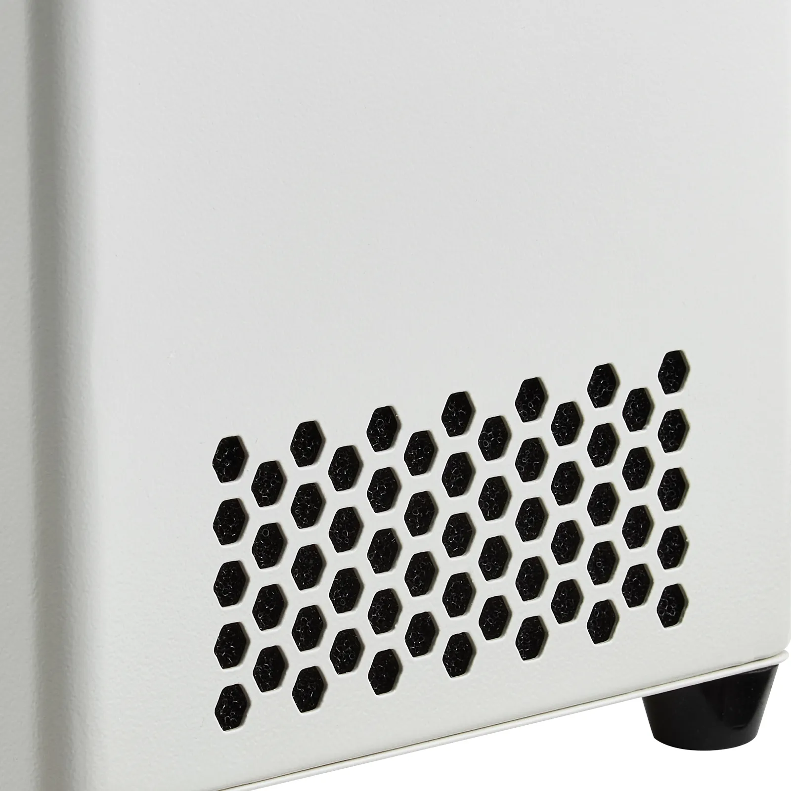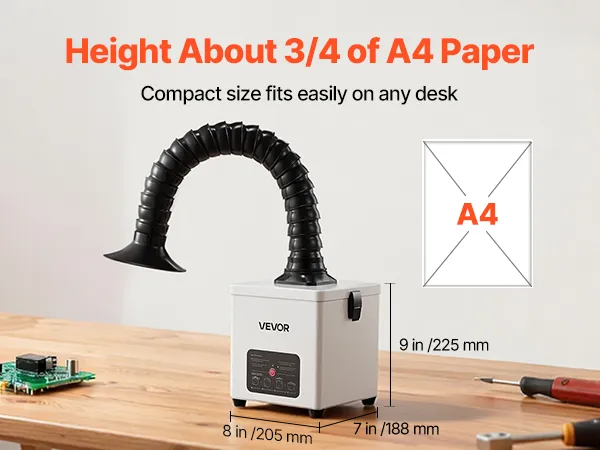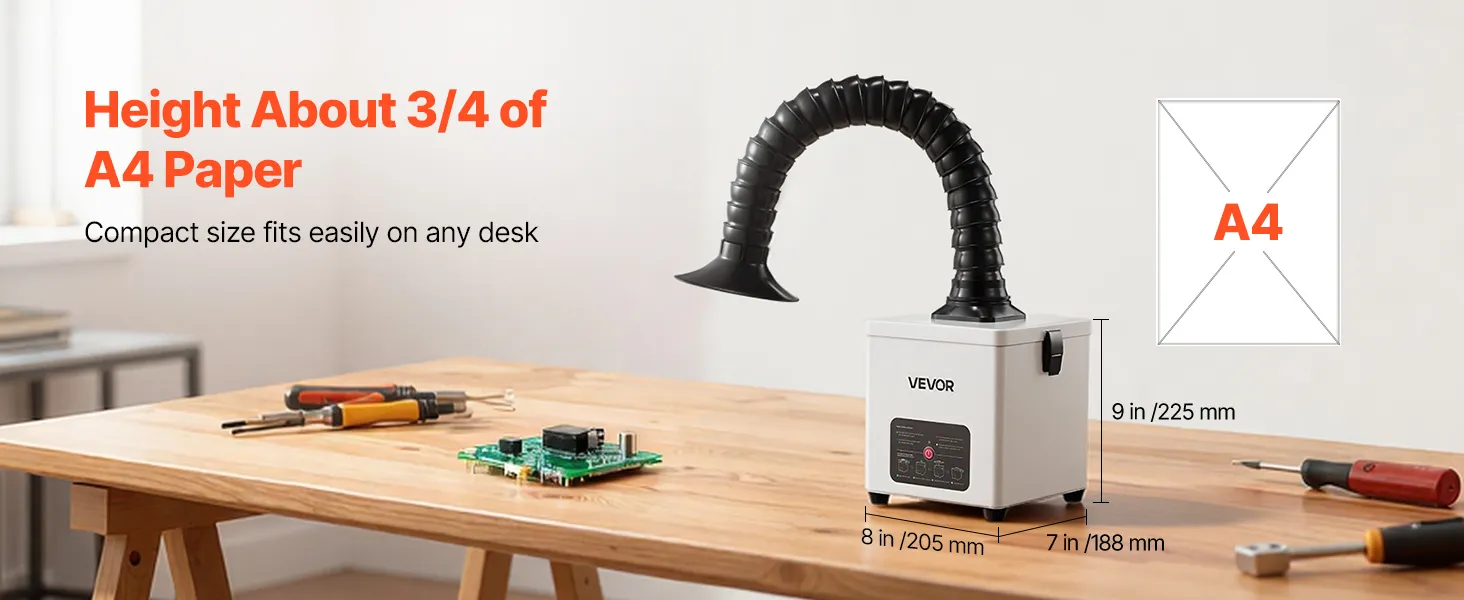 Compact en robuust: onze afzuiginstallatie heeft een metalen behuizing voor extra duurzaamheid en vier antislip rubberen voetjes voor een stabiele plaatsing op uw bureau. Dankzij het compacte ontwerp is hij gemakkelijk te vervoeren en op te bergen – ideaal voor thuisstudio's en doe-het-zelfwerkplaatsen.