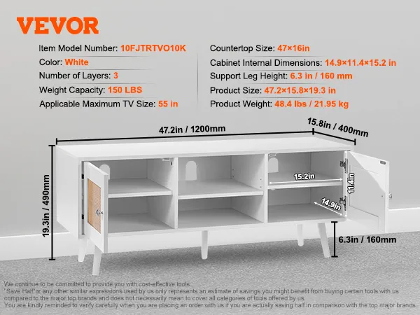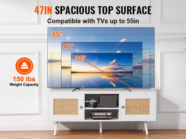 Het heeft een groot tafelblad van 47x16 inch. Het kan een 55-inch tv dragen, wat een uitstekende kijkervaring biedt. Het tafelblad kan tot 150 lbs dragen. Deze ruimte kan ook decoratieve items en snuisterijen tentoonstellen. De tv past perfect en voegt een golvende look toe aan uw kamer. U kunt verschillende items aan de zijkant van de tafel plaatsen om hem veelzijdig te maken. De VEVOR mid-century moderne tv-standaard is gemaakt om te voldoen aan zowel uw functionele als esthetische behoeften.