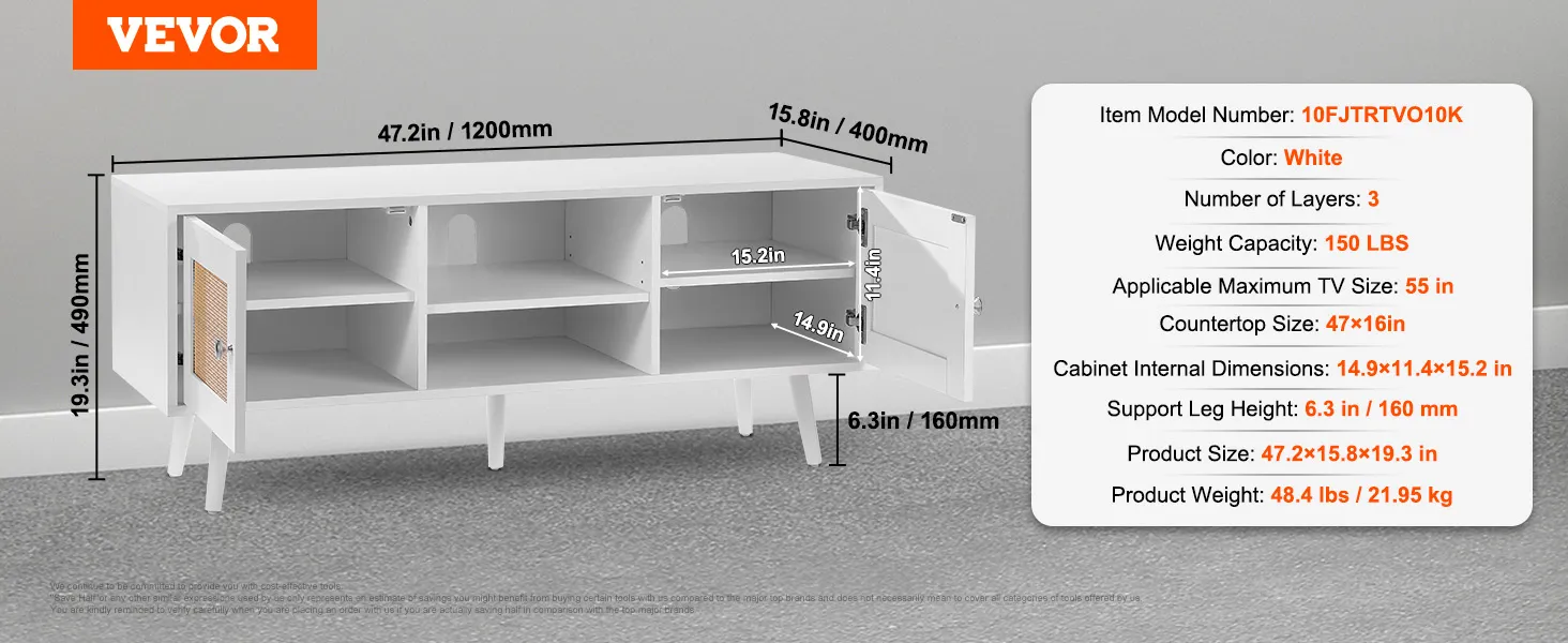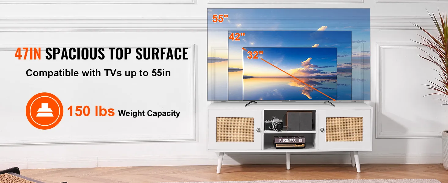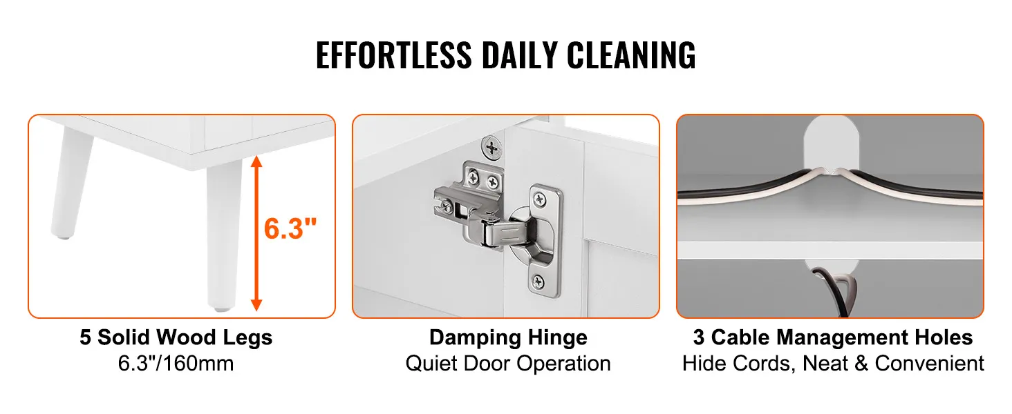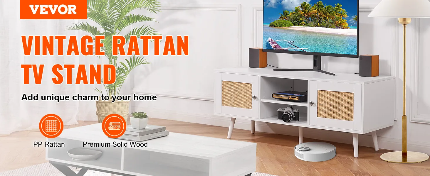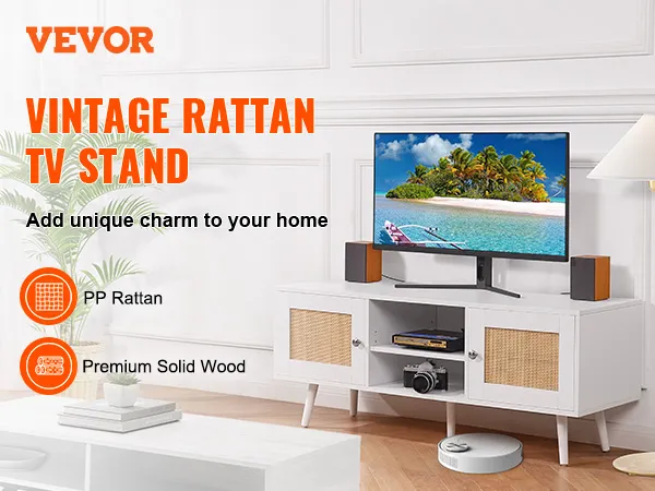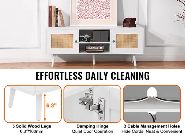 Het heeft vijf poten van massief hout. Deze poten bieden stevige ondersteuning en hebben een hoogte van 6,3 inch. Dit zorgt voor voldoende ruimte voor dagelijkse reiniging en de standaard heeft ook drie kabelmanagementgaten. Ze houden draden verborgen. De dempers op de scharnieren verminderen geluid en beschermen de deuren. Het gebruiksvriendelijke ontwerp zorgt voor eenvoudig onderhoud en een opgeruimde uitstraling. U kunt uw ruimte schoon en georganiseerd houden met minimale inspanning. De VEVOR rotan tv-console is ontworpen met gemak in gedachten.