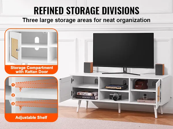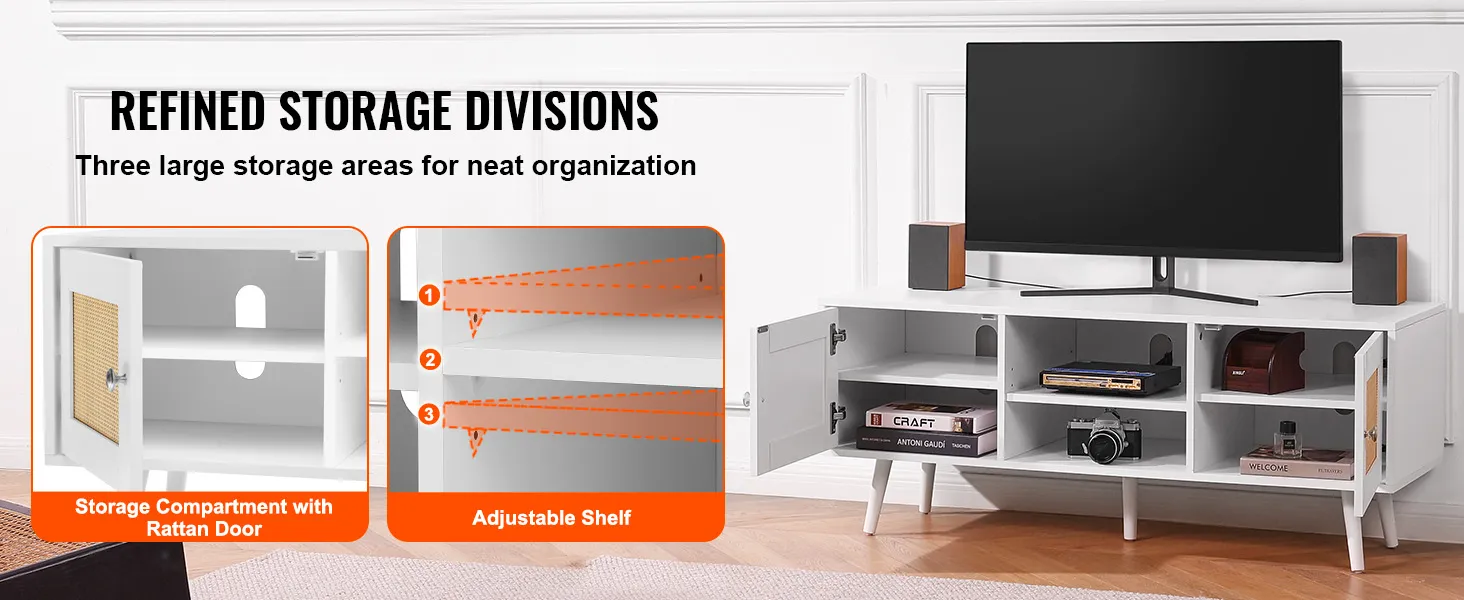 Het heeft grote opbergkasten aan beide kanten. Deze kasten hebben rotandeuren, wat bijdraagt aan hun stijlvolle look. De middelste open plank heeft een verstelbare hoogte, wat flexibele opslag biedt. U kunt dvd's, routers, audioapparatuur en boeken opbergen. Verborgen kasten houden uw spullen privé terwijl uw ruimte vrij blijft van rommel. De verstelbare planken stellen u in staat de ruimte naar wens aan te passen. Deze tv-standaard biedt voldoende ruimte voor al uw mediabehoeften. Het zorgt ervoor dat u voldoende opbergruimte hebt voor alles wat u nodig hebt.