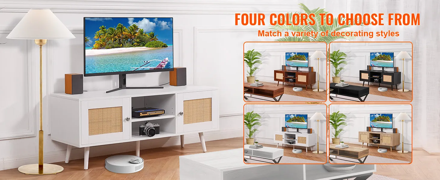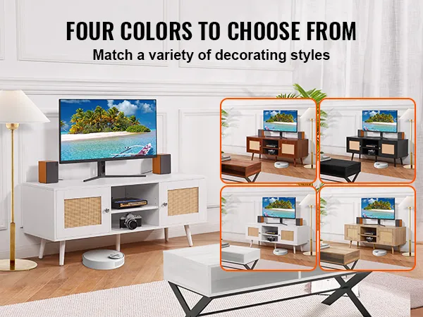 Er zijn vier kleuren die de verstelbare tv-standaard uniek maken. Wit, zwart, walnoot en eiken zorgen ervoor dat u een perfecte match vindt voor het decor van uw huis. Elke kleuroptie voegt een onverschrokken flair toe aan uw ruimte. De witte optie biedt een blitzy clean look, terwijl de zwarte optie chique elegantie brengt. U krijgt een warm en natuurlijk gevoel met de walnoot- en eikenopties. Deze verschillende kleurkeuzes stellen u in staat om uw tv-standaard aan te passen aan uw wensen. Onze rotan tv-standaard is veelzijdig en past bij verschillende interieurstijlen.