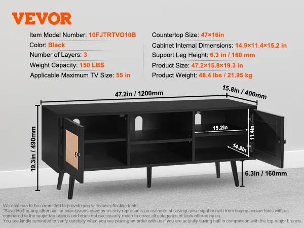The 47x16in tabletop accommodates a 55in TV and can hold up to 150 lbs. If you don't use it for a TV, the rattan TV console is also perfect for displaying decorative items.
