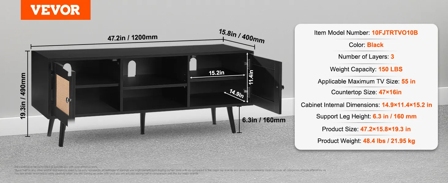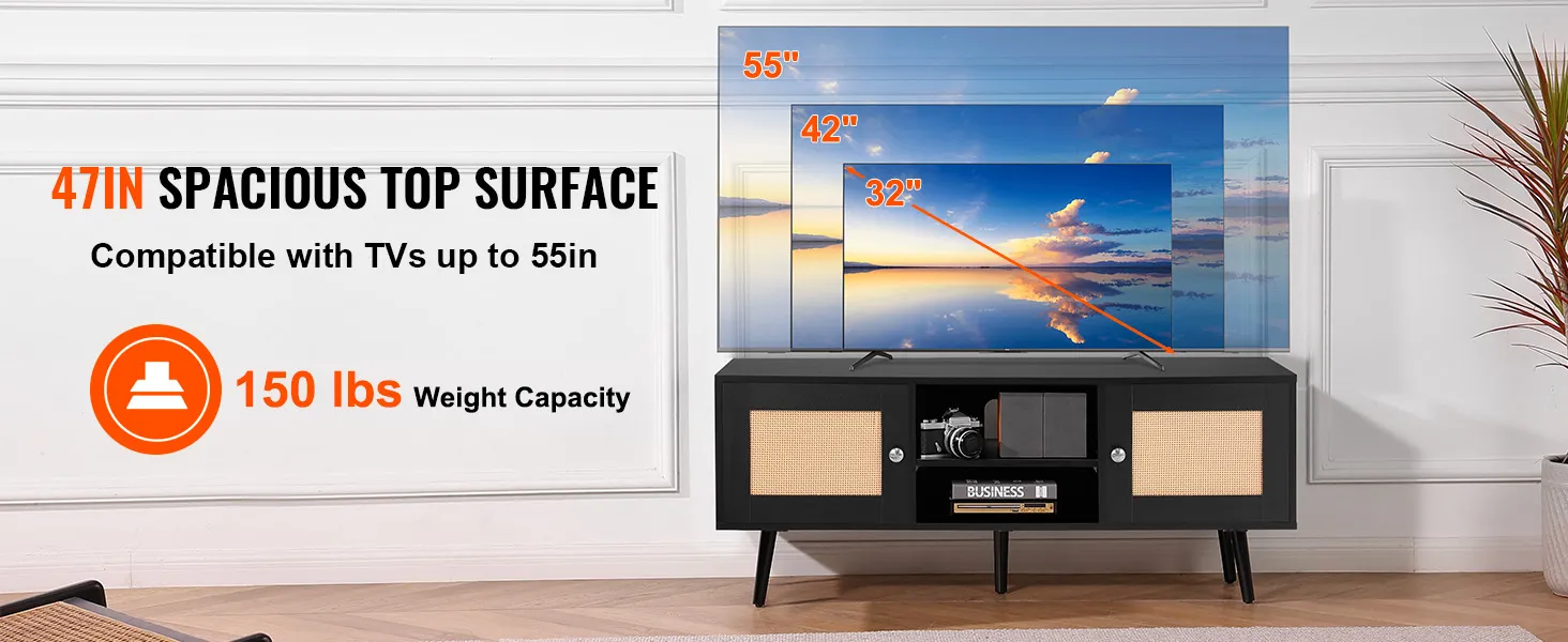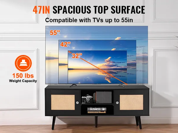 Supports 55in TV: With a spacious 47x16in tabletop, this rattan TV console can accommodate a 55in TV, providing an exceptional viewing experience for movies or video games. The tabletop can hold up to 150 lbs and can also display decorative items and various interesting trinkets.