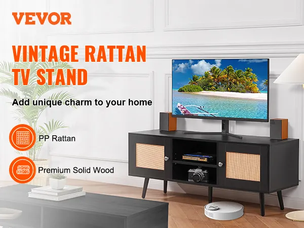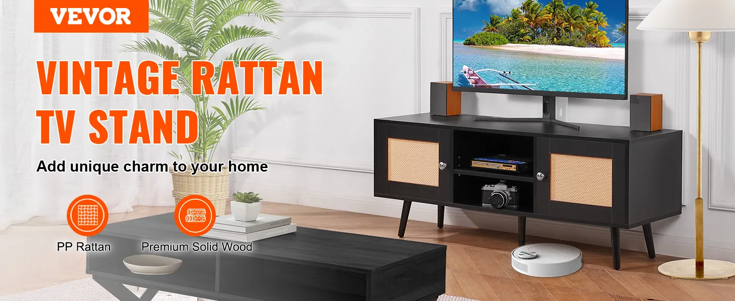 VEVOR Rattan TV Stand, Boho TV Cabinet for 55 inch TV, Mid Century Modern TV Stand, Rattan TV Console with Adjustable Shelfs for Living Room, Media Room, Black