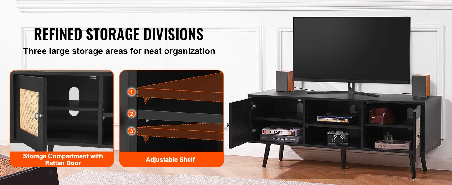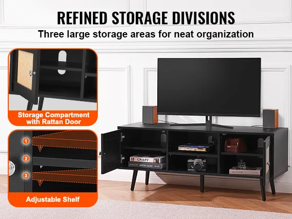 Ample Flexible Storage Space: Featuring large storage cabinets on either side with rattan doors, the boho TV stand offers hidden storage space to keep things private and uncluttered. The middle open shelf has an adjustable height from 0mm to 64mm, allowing you to customize the storage space for DVDs, routers, audio equipment, CDs, books, and other items.