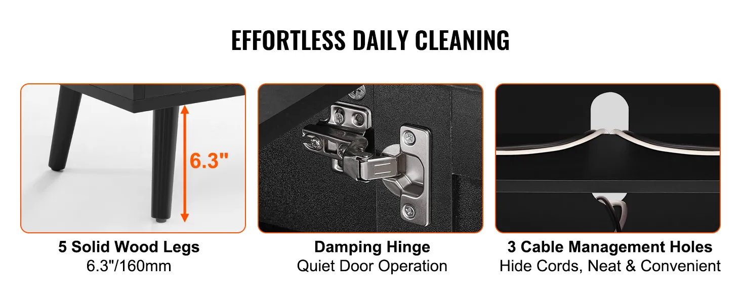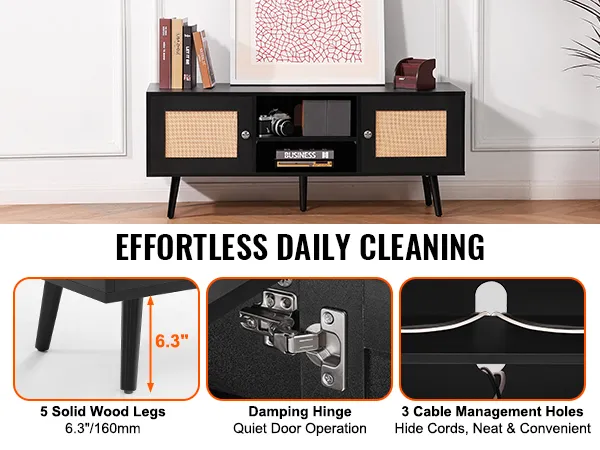 User-Friendly Details: Five solid wood legs provide strong support for the rattan TV cabinet, with a height of 6.3in ensuring enough clearance for daily cleaning and allowing a robot vacuum to pass through easily. Three cable management holes help hide messy wires. We use dampers on the hinges to reduce noise and protect the doors, ensuring they close quietly.