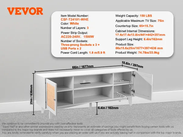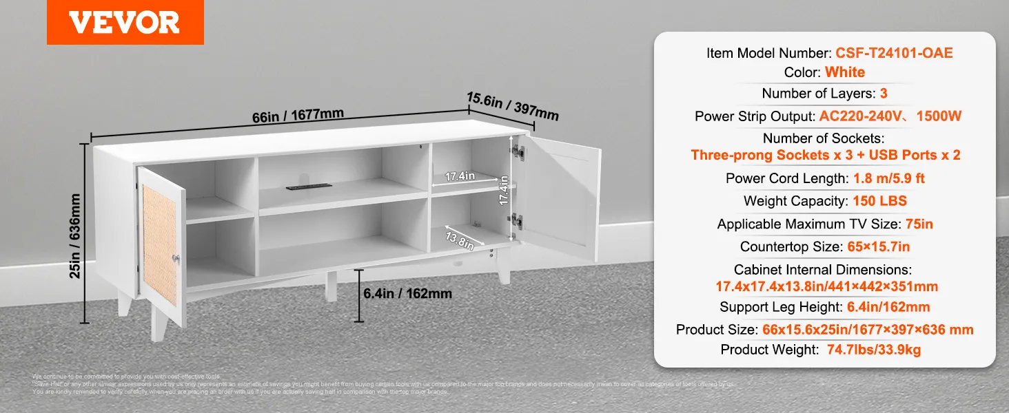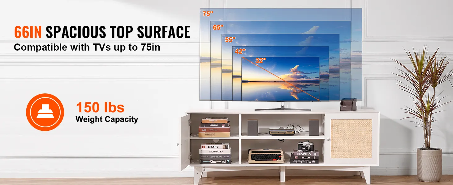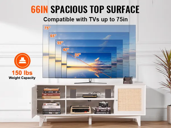 Fits 75" TV: Featuring a spacious 65" x 15.7" (165 x 40 cm) tabletop, this Boho TV stand can accommodate a 75" TV for an exceptional viewing experience when watching movies or playing video games. The tabletop can hold up to 150 lbs (68 kg) and can also accommodate decorative items and various interesting trinkets.
