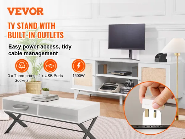 This rattan TV stand features an integrated socket in the middle shelf for easy power connection and cable management, adding extra convenience to your living room.