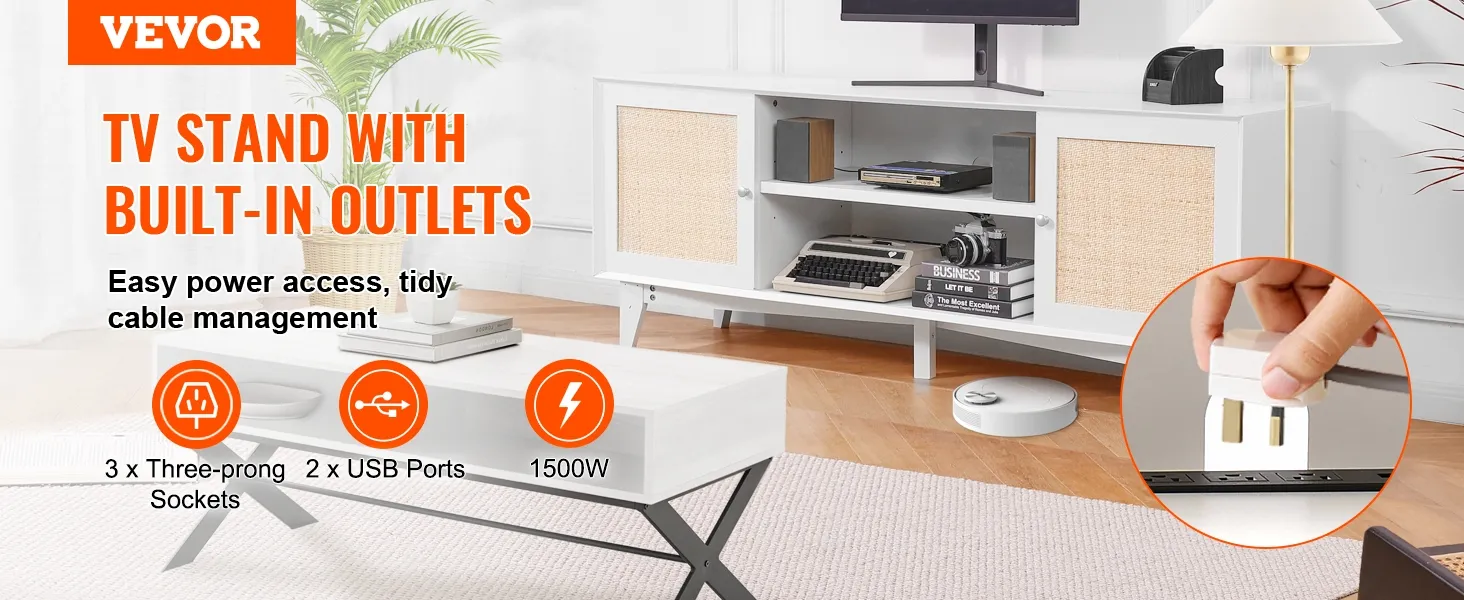 Convenient Built-in Socket: Our rattan TV stand has a built-in socket in the middle shelf, making it easy to plug in power when needed and keep cables organized. Perfect for the bedroom or living room as a TV stand or in the hallway or study as a display cabinet, it offers a cozy and practical new experience.