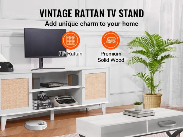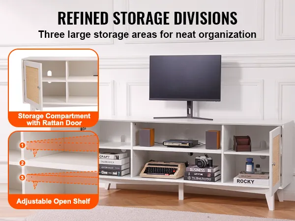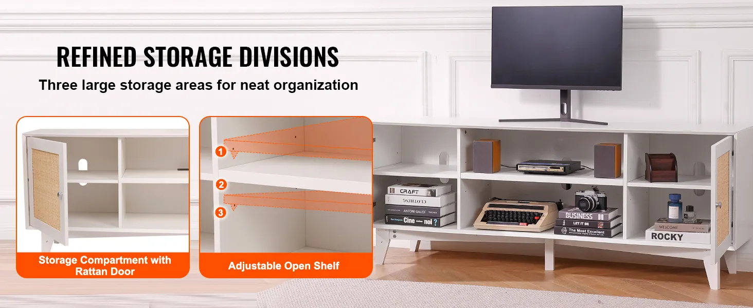 Plenty of Flexible Storage Space: The rattan entertainment center features spacious cabinets with 2 shelves and rattan doors, providing hidden storage space to keep the room private and tidy. The middle open shelf is height adjustable from 0mm to 64mm, allowing you to customize the storage space for DVDs, routers, audio equipment, CDs, books and other items.