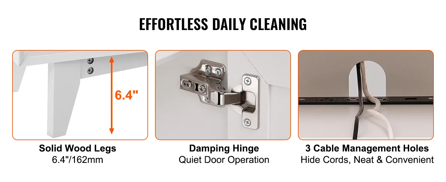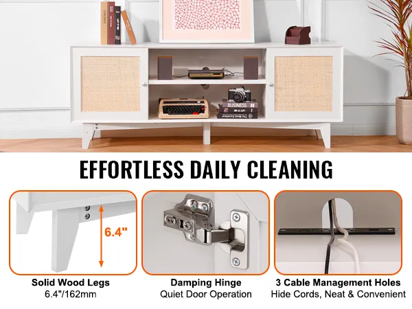 User-friendly details: The X-shaped solid wood legs provide strong support for the rattan TV cabinet and 6.4 inches (160 mm) in height provide enough clearance between the stand and the floor for easy cleaning and to allow a robot vacuum cleaner to pass through. Three cable management holes help hide tangled wires. To reduce noise and protect the doors, we equipped the hinges with dampers that ensure the doors close quietly.