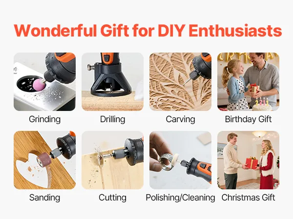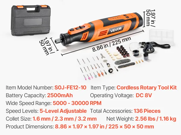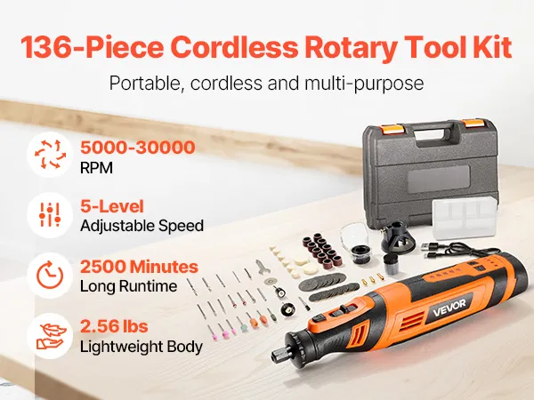 De 136-delige VEVOR DC8V accugereedschapsset biedt veelzijdige functies voor snijden, slijpen, boren, schuren, snijden, graveren, polijsten en reinigen. Met 5 instelbare snelheden (5000-30000 tpm) en een slank, lichtgewicht ontwerp is hij ideaal voor diverse creatieve doe-het-zelfprojecten.