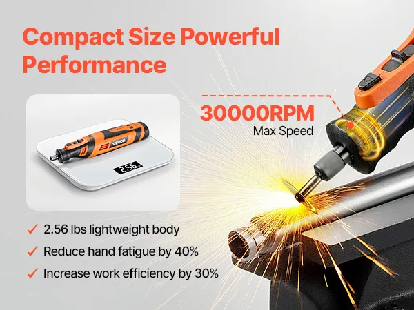 Met een maximumsnelheid van 30.000 tpm voltooit dit roterende gereedschap taken snel en effectief. Het lichtgewicht ontwerp, gecombineerd met een ergonomische handgreep, zorgt voor comfort tijdens langdurig gebruik en verbetert de precisie en efficiëntie.