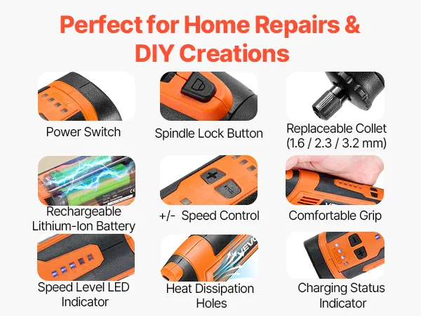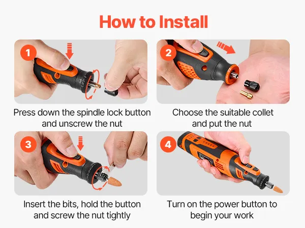 Multifunctionele set: wordt geleverd met 1,6 mm (1/16"), 2,3 mm (3/32") en 3,2 mm (1/8") spantangen, plus een spindelvergrendelingsknop voor snel wisselen van accessoires. Wissel eenvoudig tussen verschillende bits voor huishoudelijke reparaties, het polijsten van sieraden, houtsnijden, schuren, snijden en andere toepassingen.